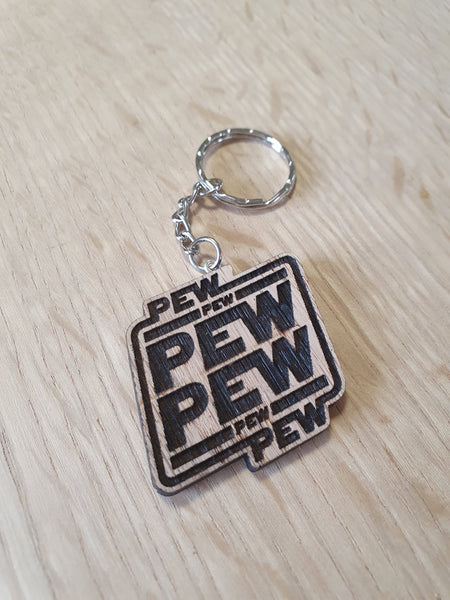 Lasercut wooden keyring keychain. Starwars Pew Pun - Unique Gift